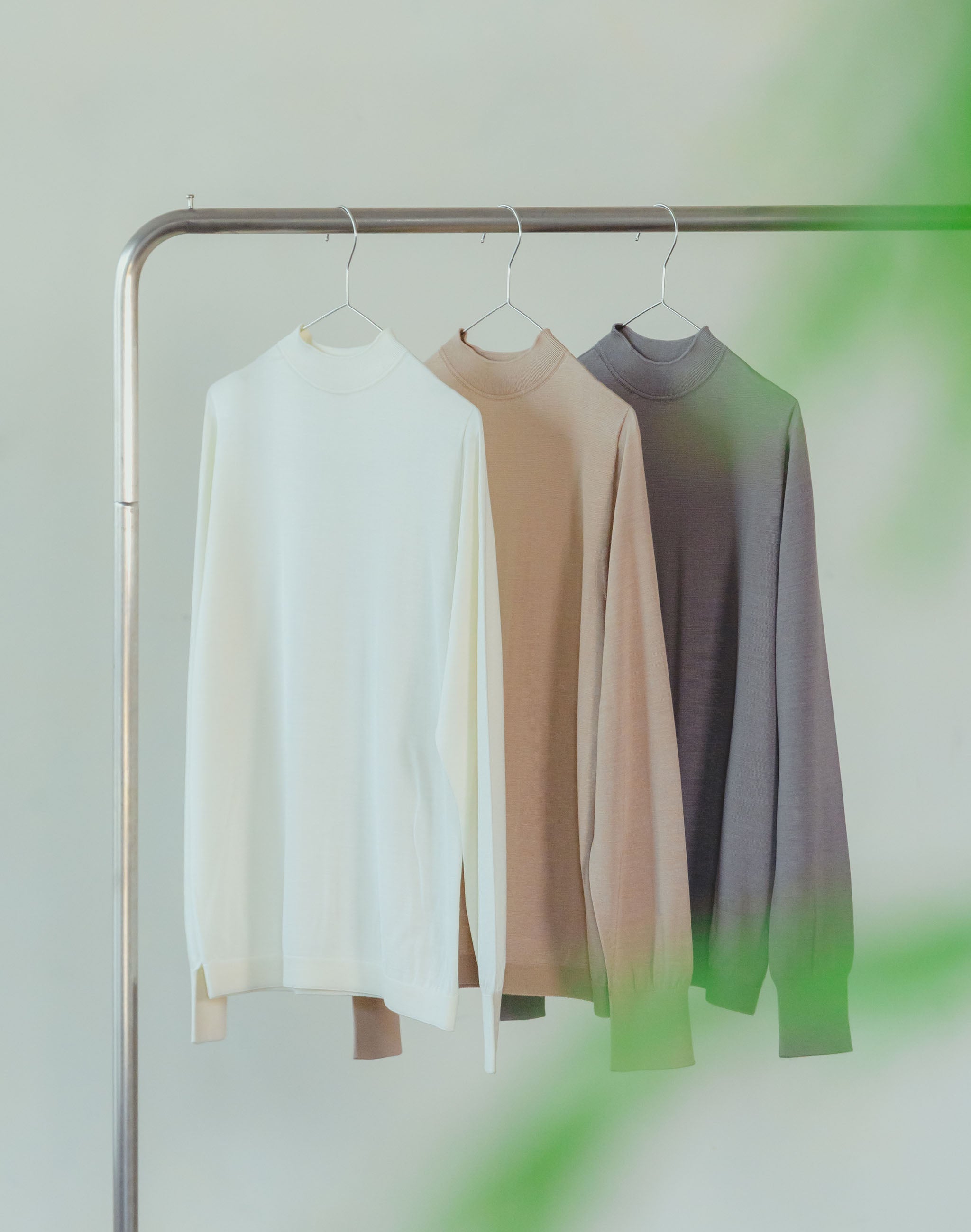 タートルネックより軽やかで、クルーネックよりも上品に映える絶妙なデザインが、カジュアルからオフィス、お出かけまで、幅広いシーンに活躍してくれます。