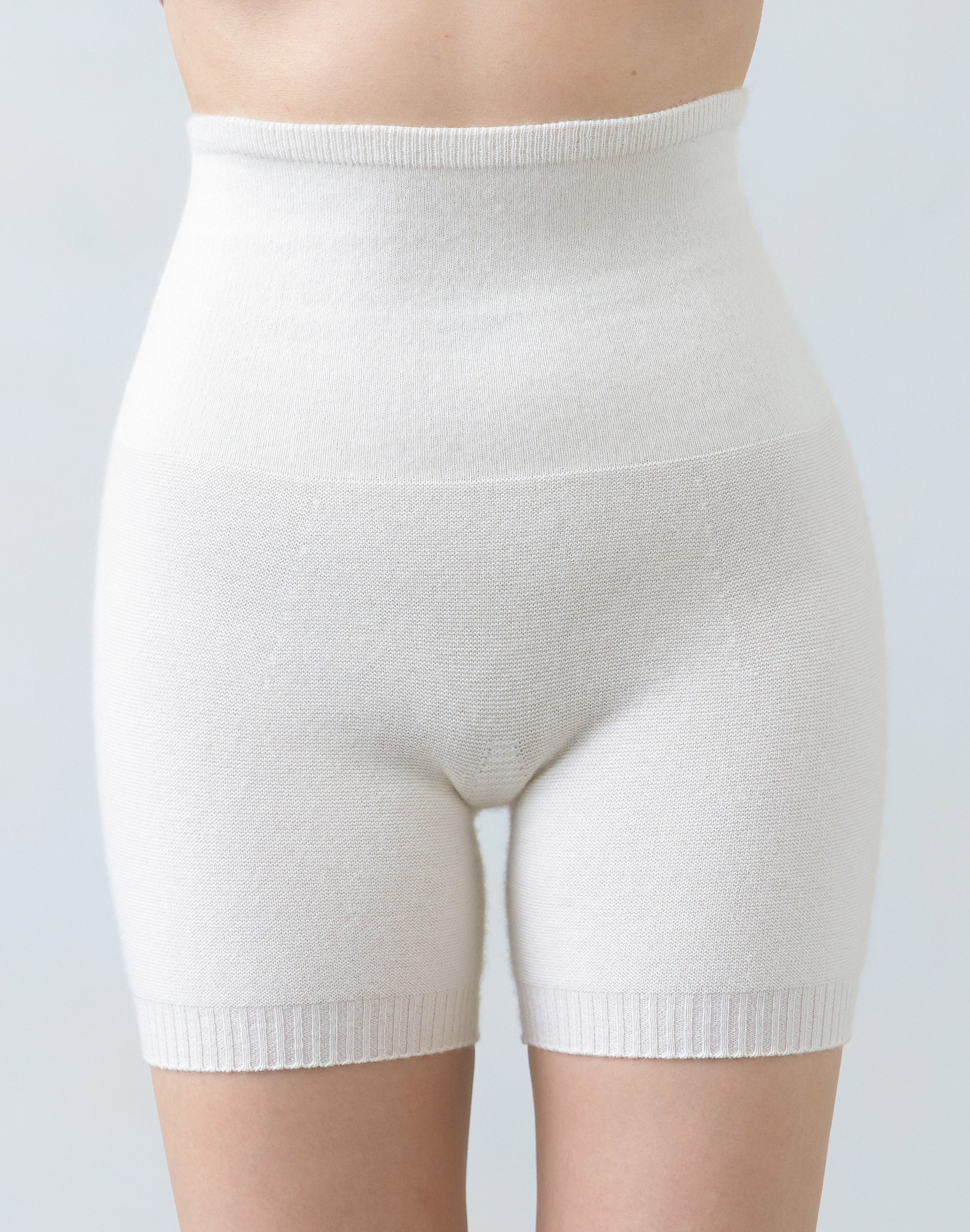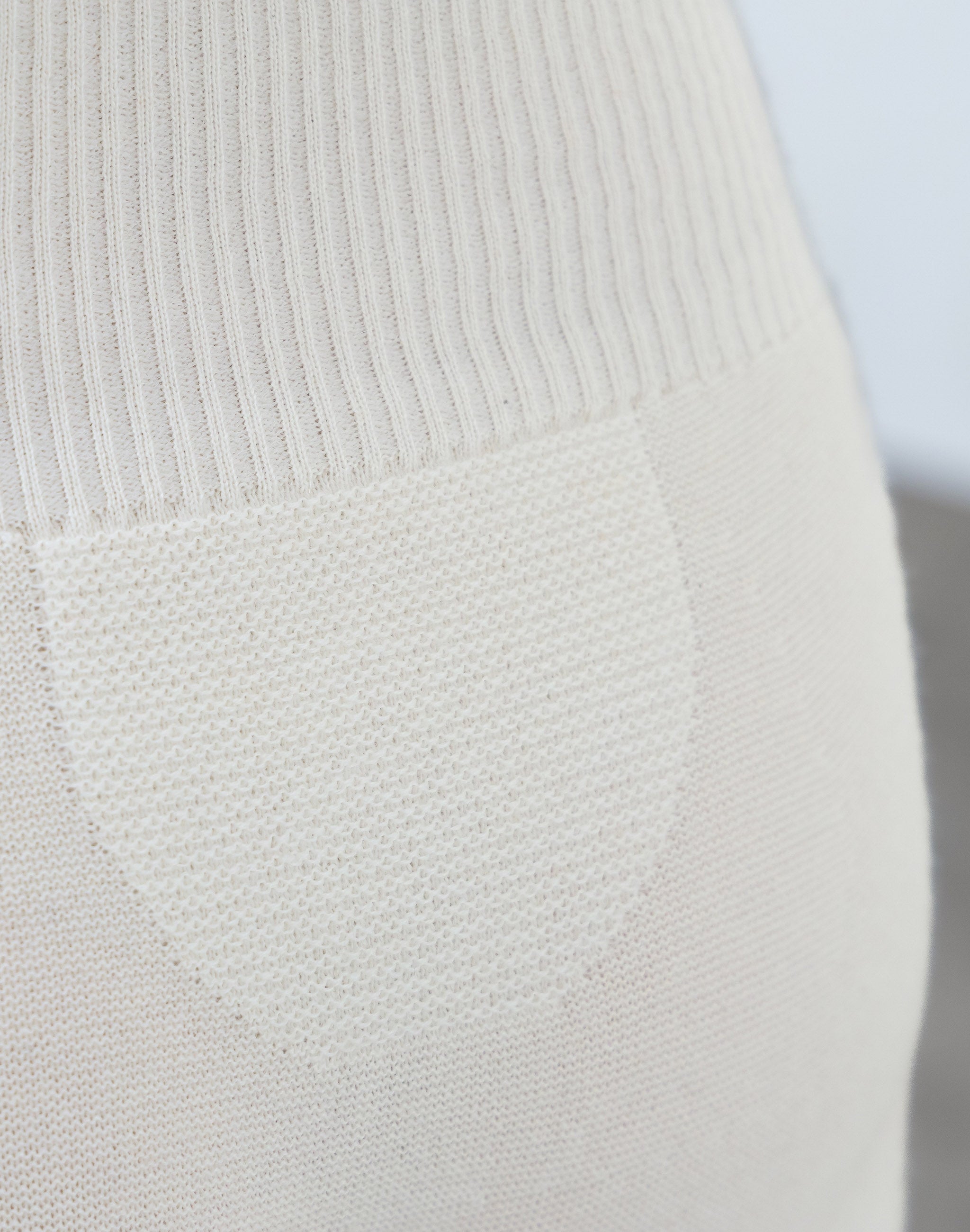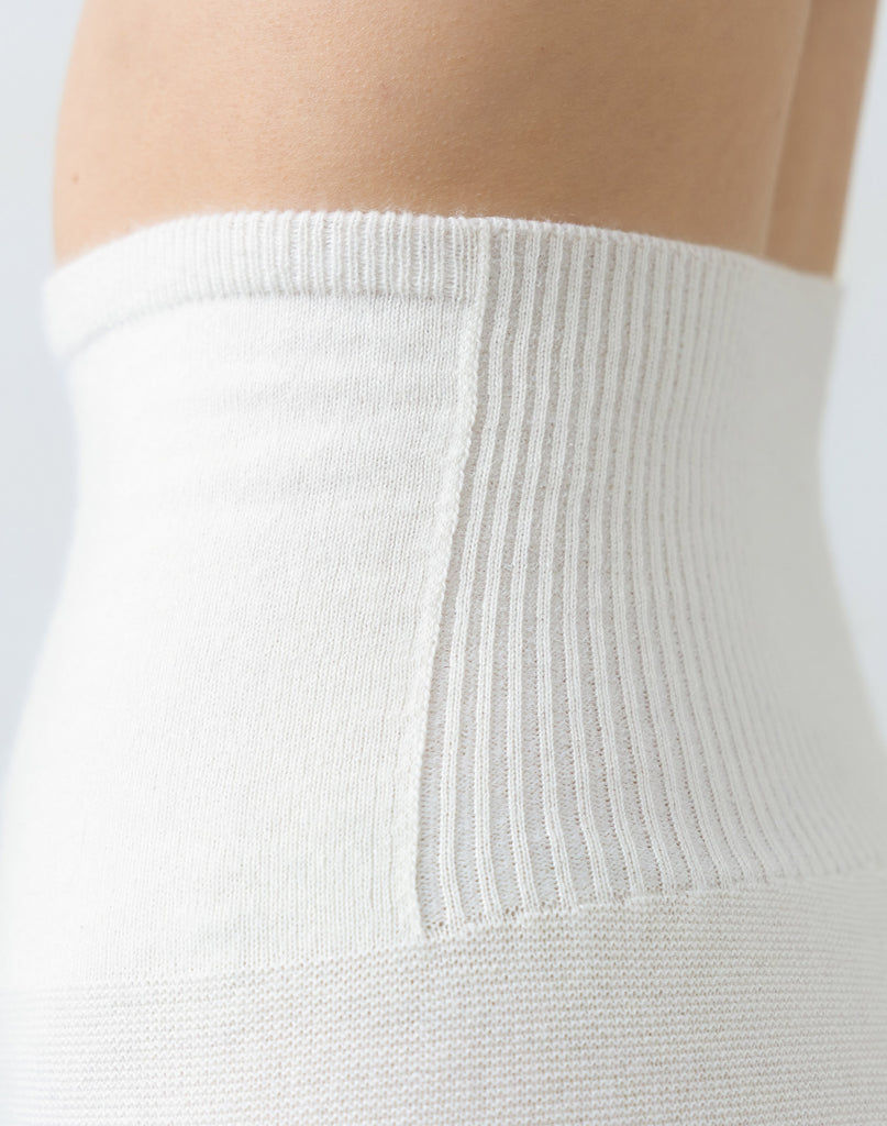 ハイウエストと上下端のリブ編みが熱の放出をきっちりとガードし、仙骨と股間部を特殊な編み目にすることで、大切な箇所の温め効果をUPしました。